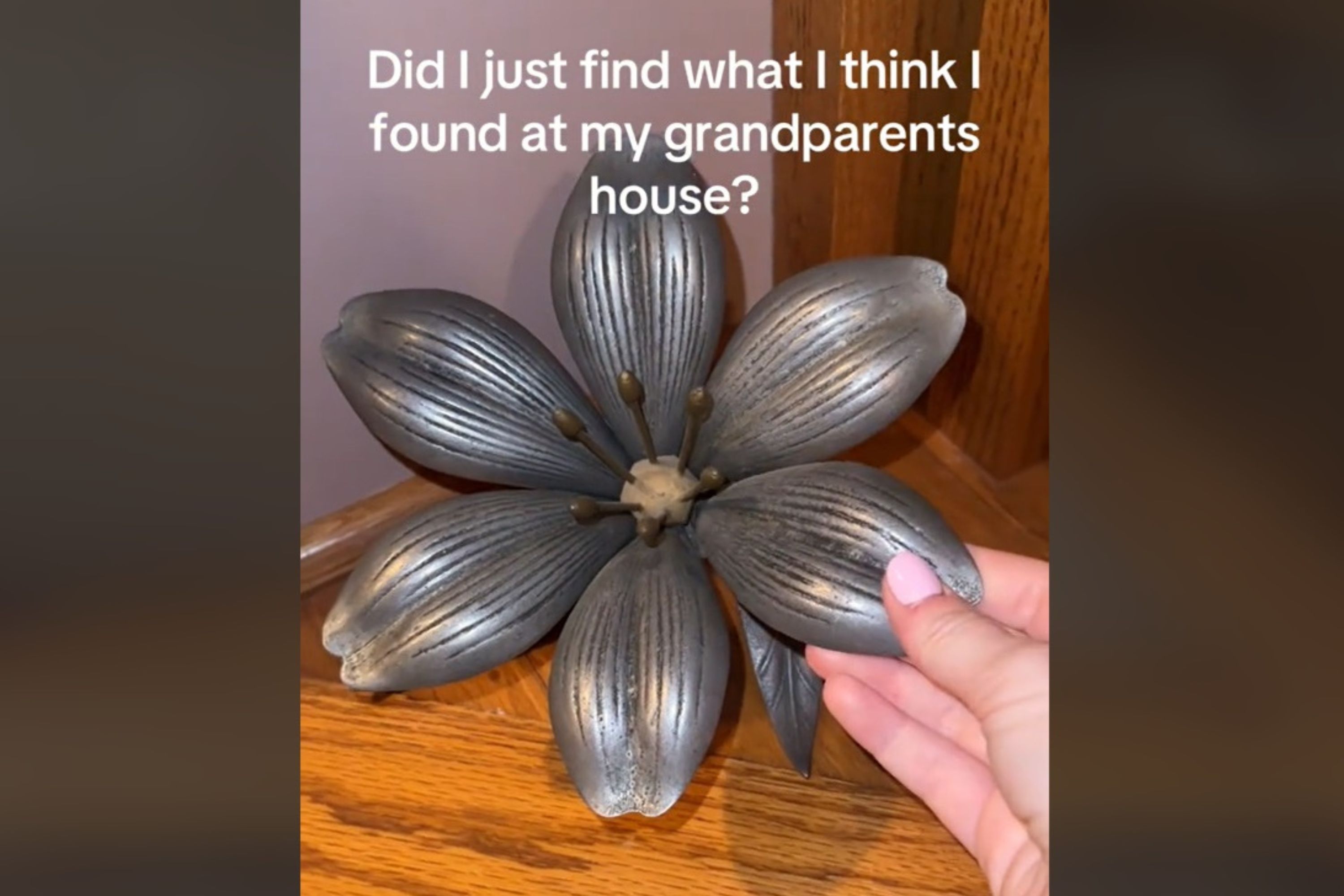 The video shows the poster’s hand approaching a floral-themed decorative item that’s been in her grandparents’ home for decades. A note overlaid on the clip reads “Did I just find what I think I found at my grandparents’ house?”