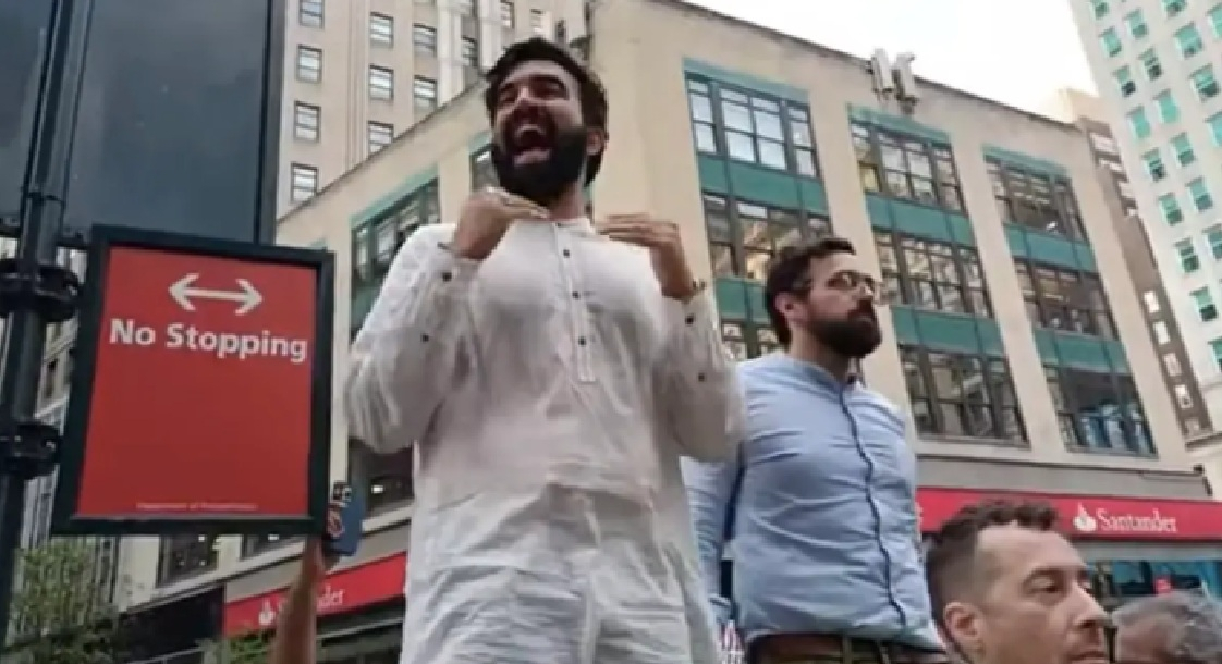 “When I grew up in this city, I grew up hearing a term ‘progressive except Palestine.’ I grew up hearing that it was normal to hold an inconsistency only when it applied to Palestinians,” he shouted at the rally.